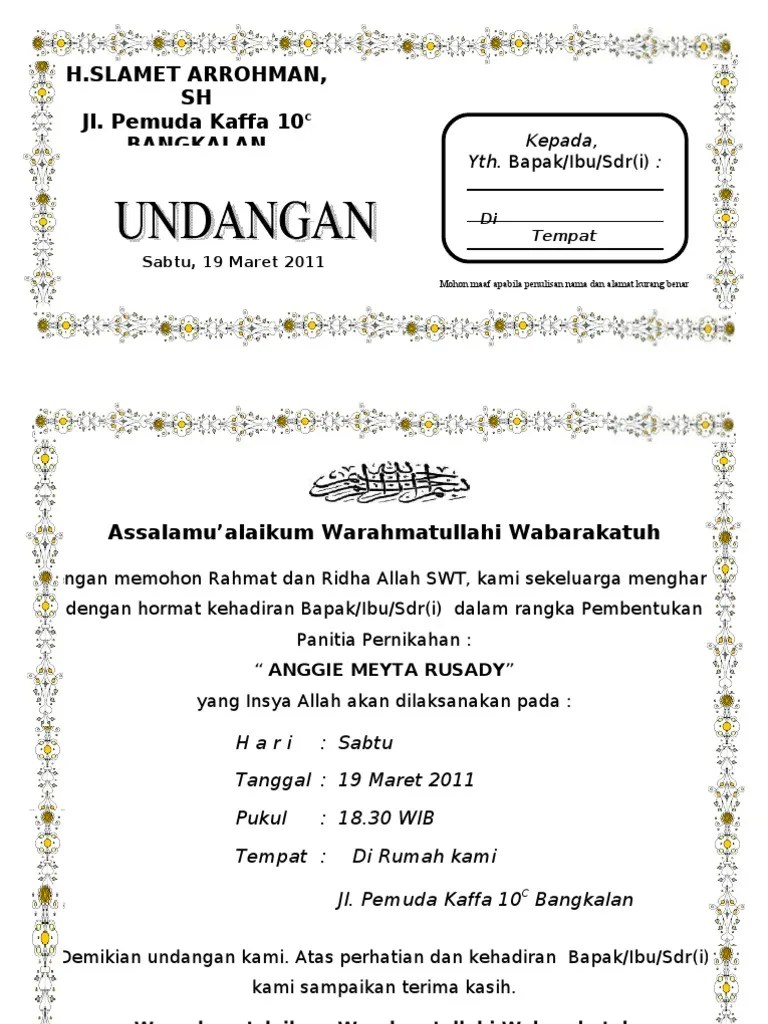 Contoh undangan pembentukan panitia pernikahan word seputar bentuk. Contoh undangan pembubaran panitia sunantan setelah resepsi by heru7isworo. Contoh surat undangan rapat panitia pernikahan. Itulah yang dapat kami bagikan terkait download undangan pembentukan panitia pernikahan di word. Mengetik undangan, menulis alamat, nama, kontak orang yanga kan .